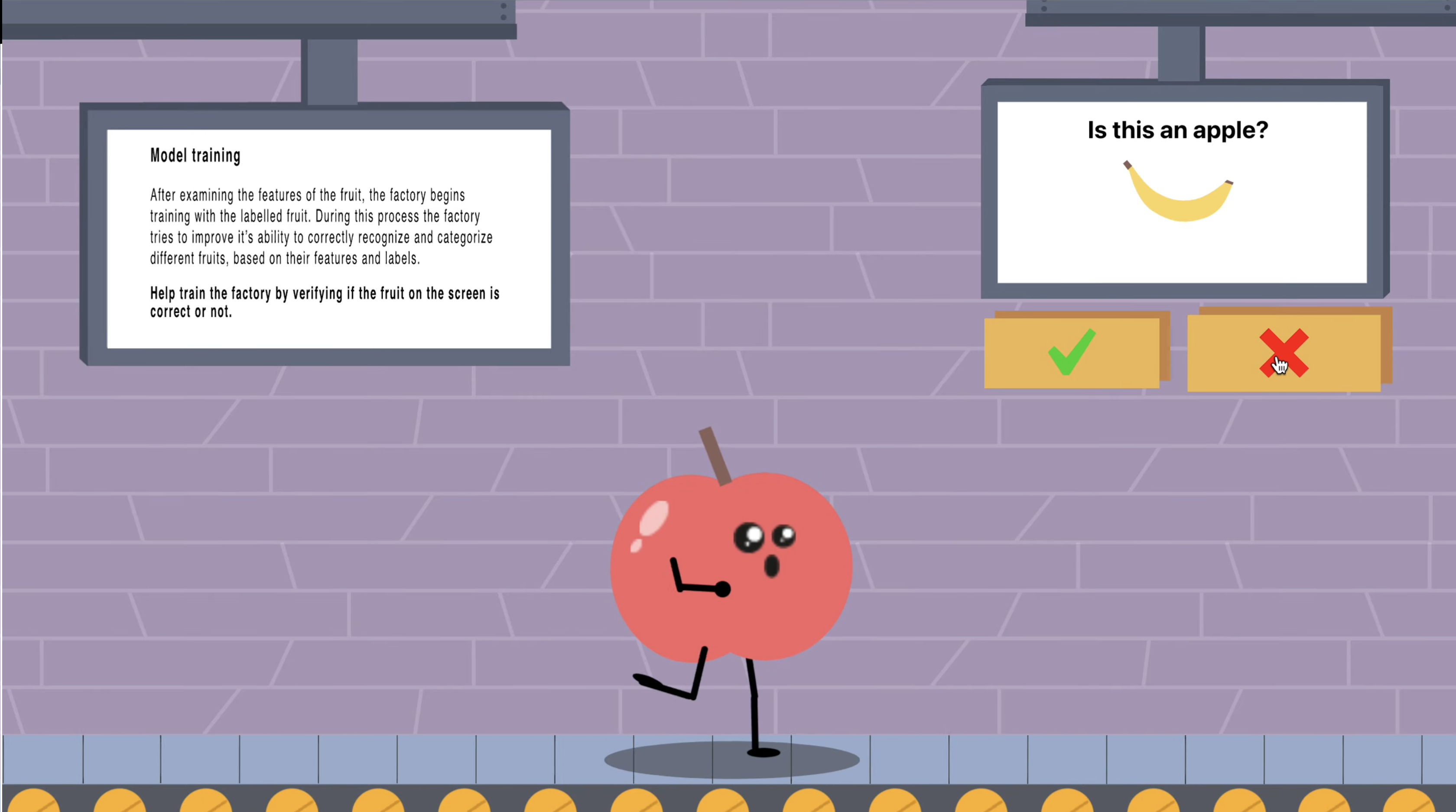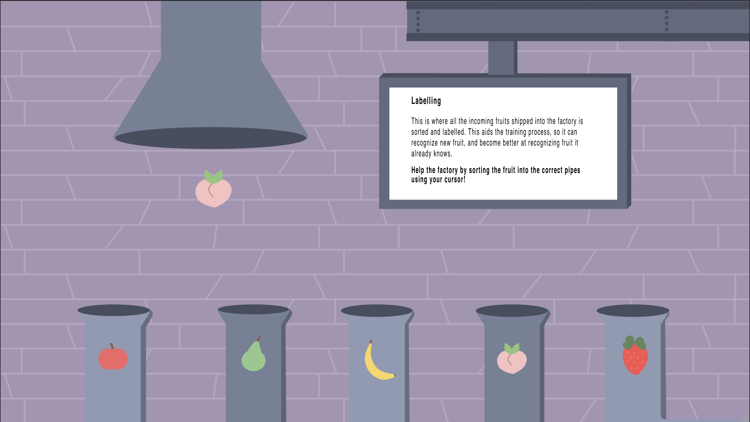 "The Fruit Factory" is an interactive web application that teaches general audiences how AI image recognition models are trained, using scrollytelling, animations, and microgames built around a fruit factory metaphor.