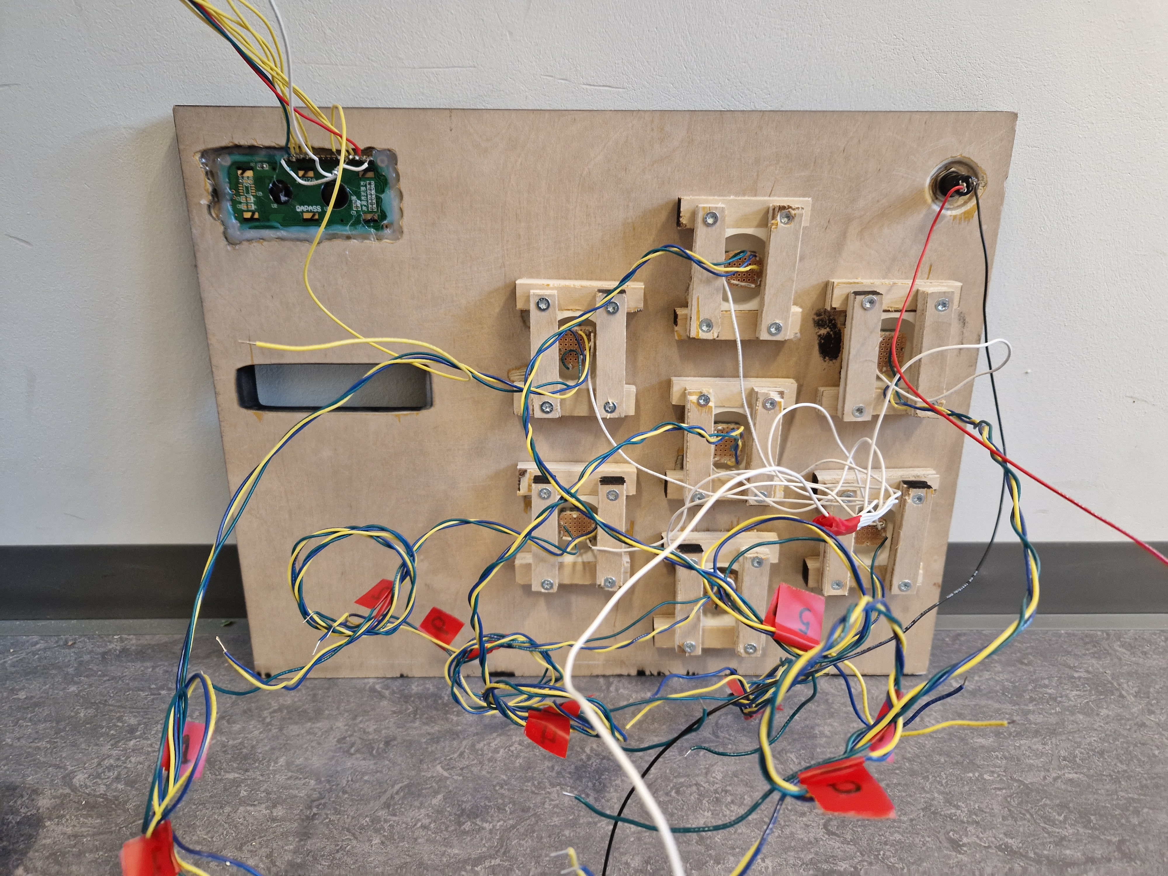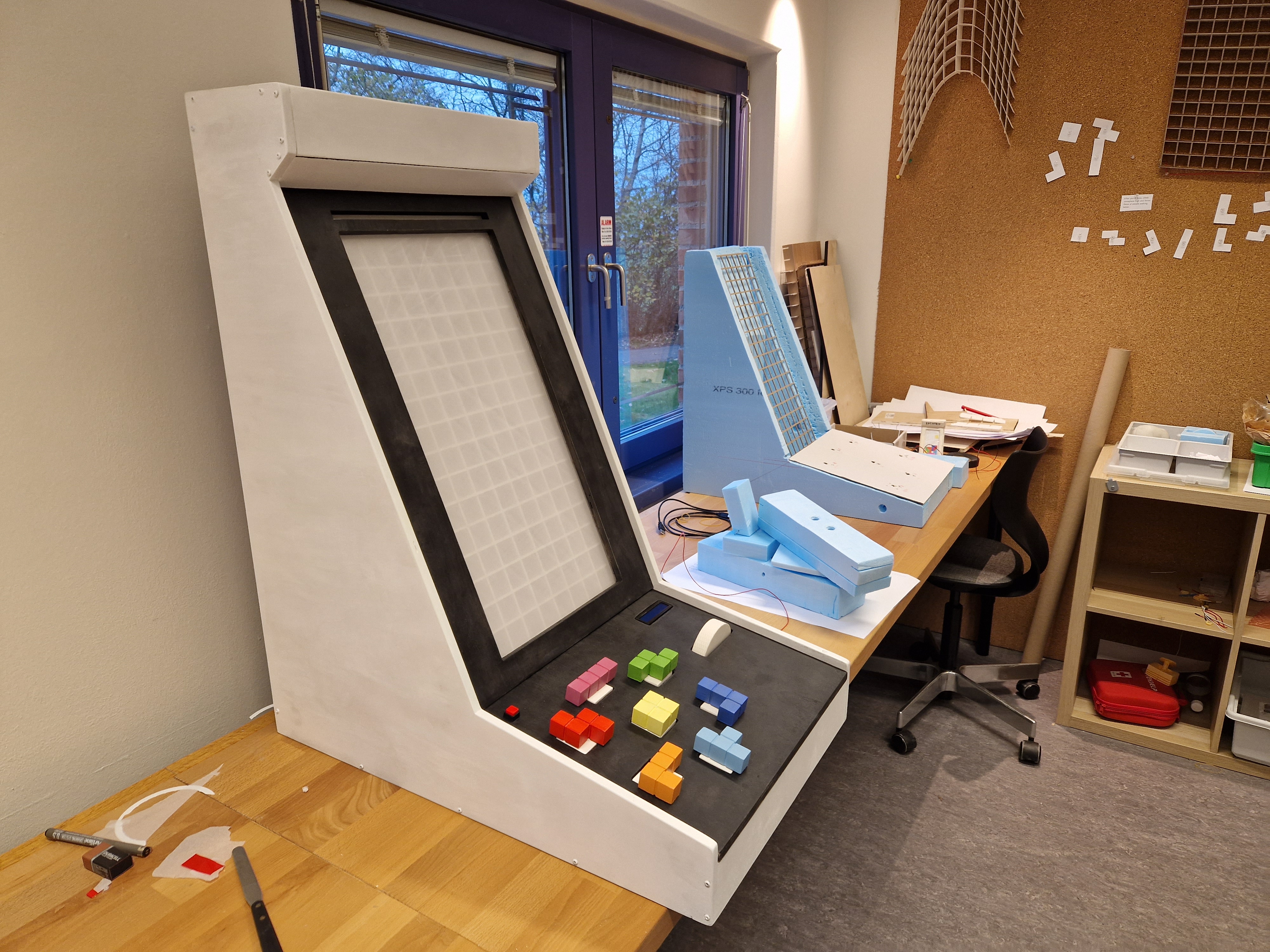 We built the project across two main iterations, which kept things honest. Each round of making was followed by actual user testing that shaped what came next. The first version was rough around the edges: cardboard cabinet, basic wiring, and no tactile feedback on the rotating pieces. Testing revealed pretty quickly that players wanted to feel something when a piece clicked into place, and that color-matching between the physical pieces and the on-screen game was non-negotiable for the controls to feel natural.